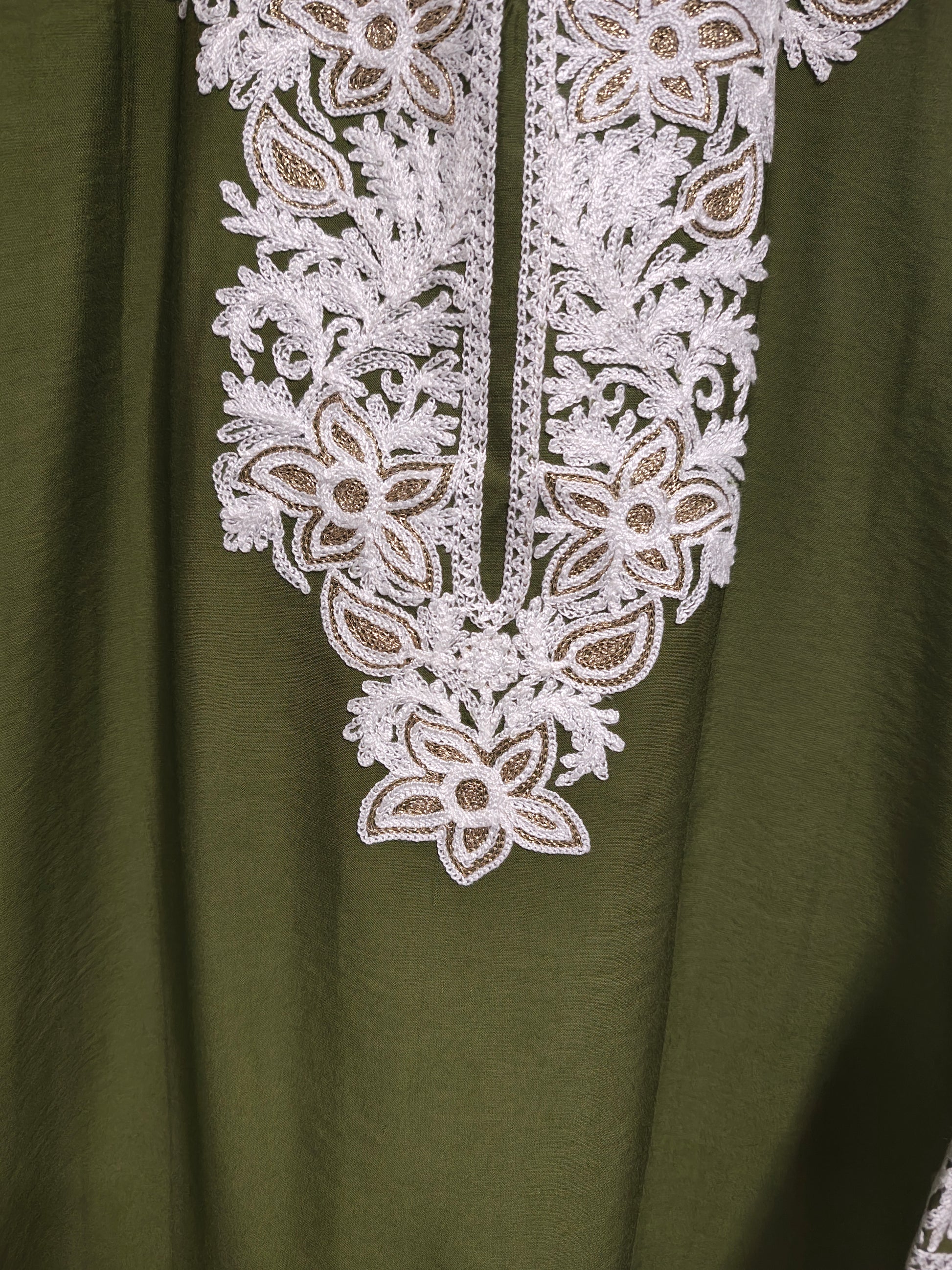 Kashmiri Embroidered Rayon Silk Kurti - Olive Green